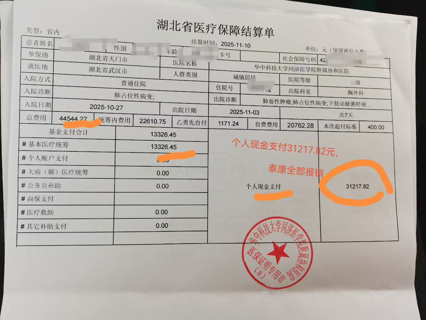 客戶1:去年體檢發現肺結節,今年手術病理結果為肺原位癌,住院總費用44544.27元,居民醫保報帳13326.45元,餘下31217.82元泰康百萬醫療全部報帳,客戶一分錢也沒花,而且客戶買的泰康醫療險保證續保。 為泰康的良心醫療點贊。
