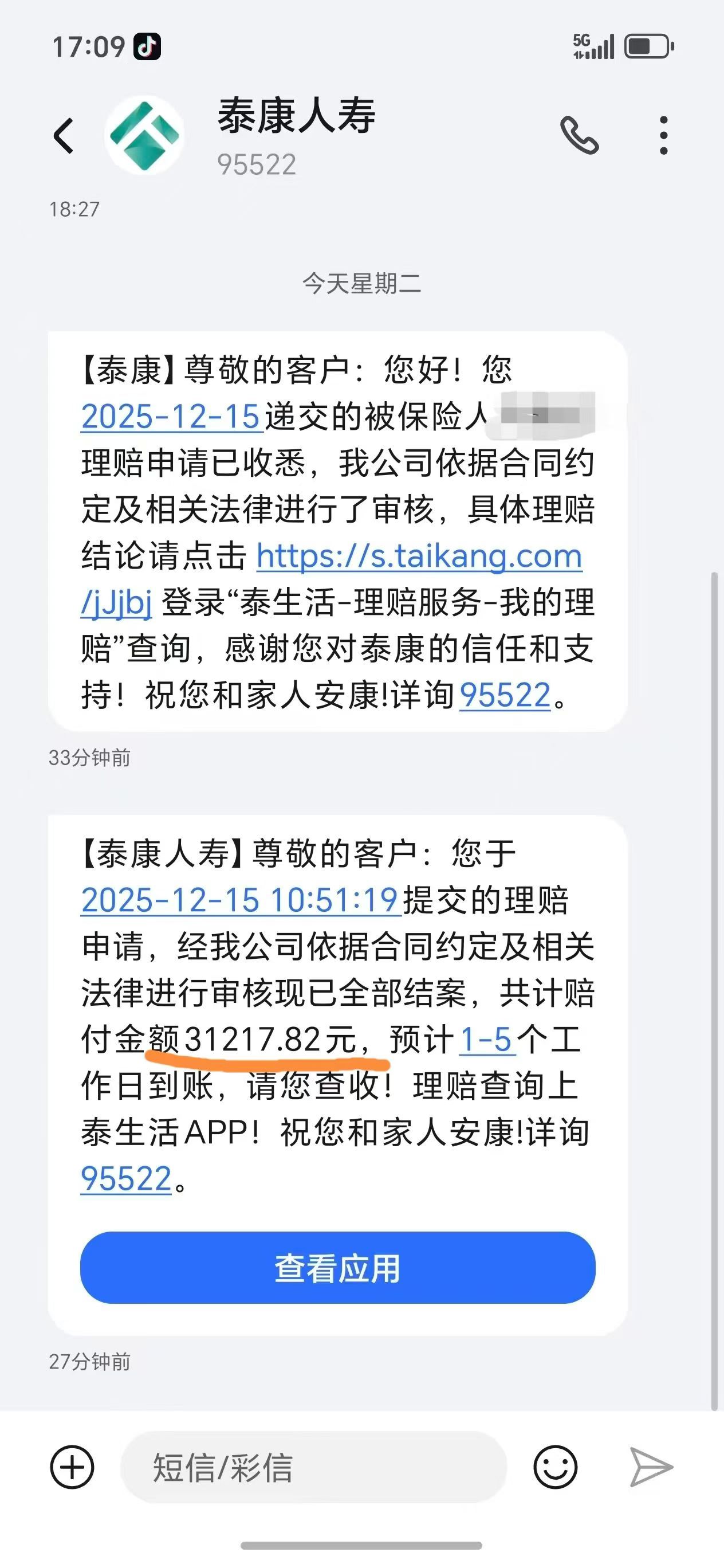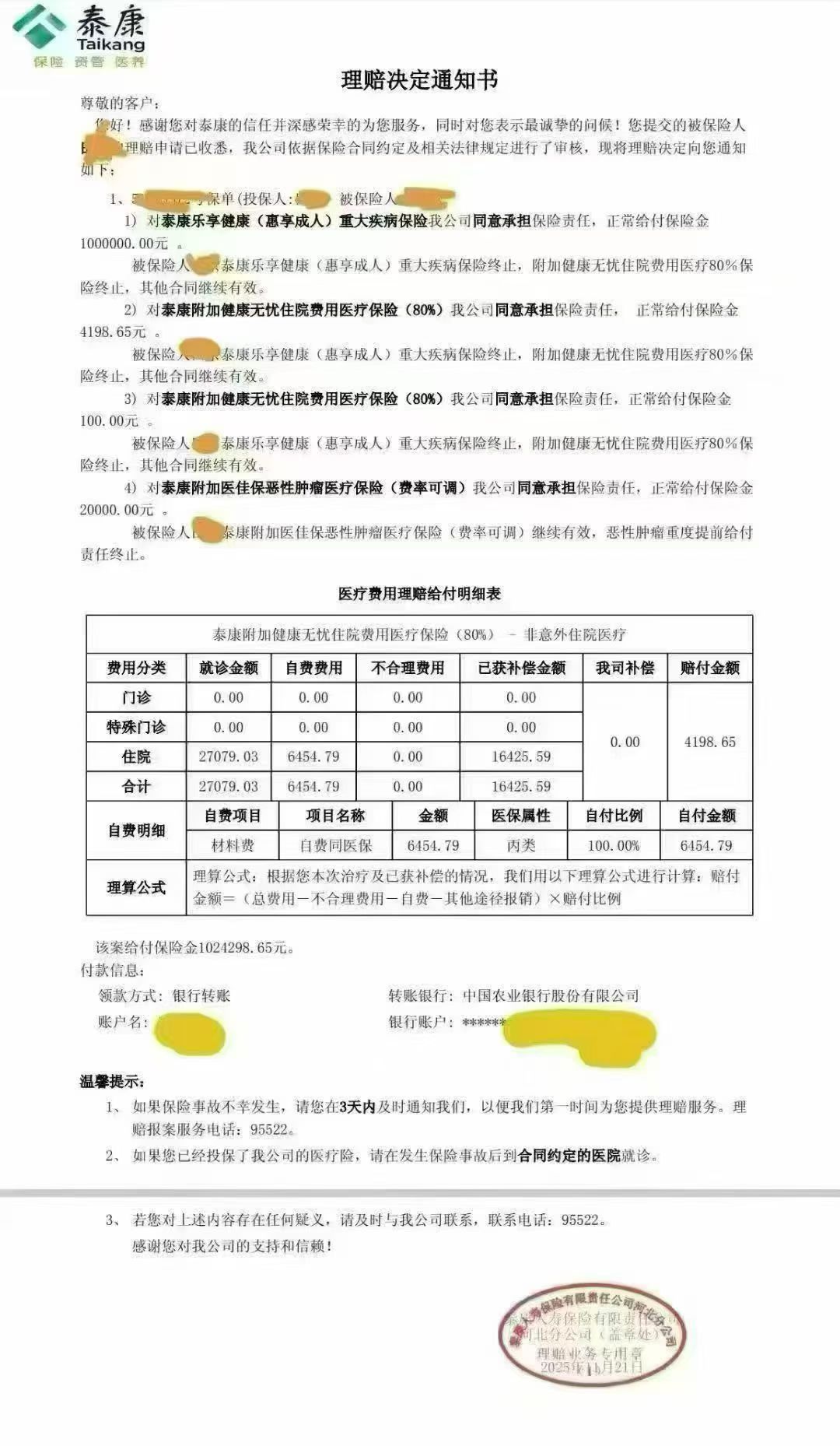 客戶2:重疾住院花費27000多,泰康理賠後不但不花錢,額外再賠償102萬多,這就是商業保險,重疾險+百萬醫療+無憂小醫療=看病不花錢,萬一生大病還賺錢。