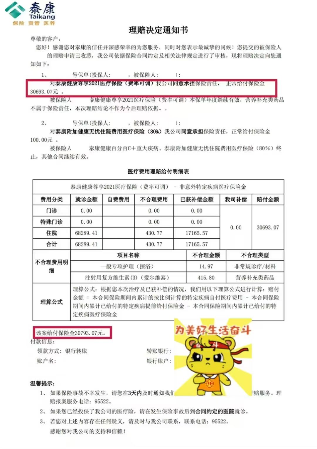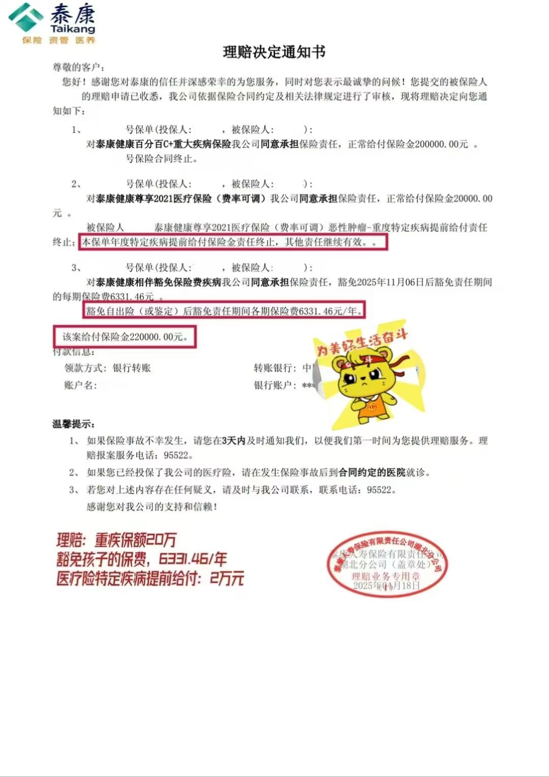 客戶體檢發現肺磨玻璃結節,懷疑肺癌,果斷手術,病檢結果是肺微侵潤腺癌,泰康重疾險理賠了20萬,醫療險賠了5萬多,合計賠付250793元,豁免了孩子的重疾保費6000多/年。 重疾險+百萬醫療=人人必備!
