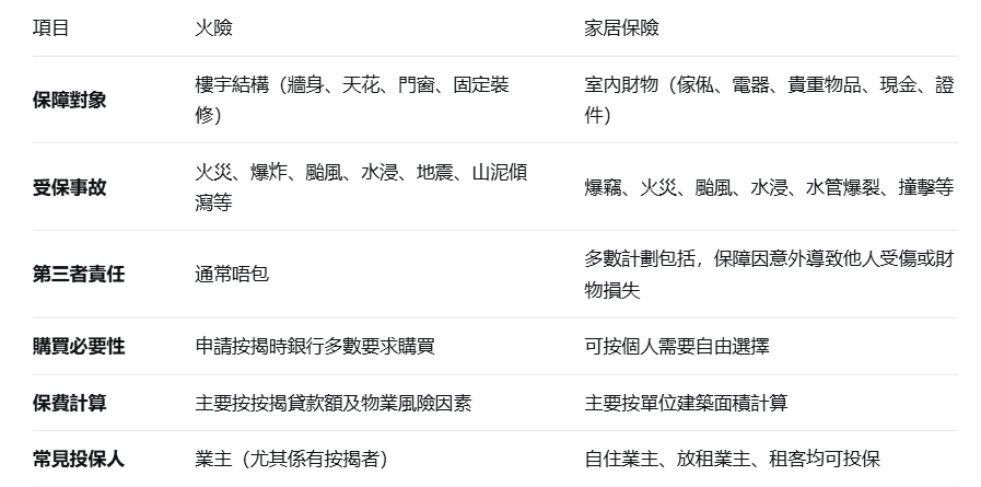火險同家居保險,一個保間屋嘅「軀殼」,一個保入面嘅「靈魂」。兩者各司其職,並唔能夠互相取代。如果你係有按揭嘅業主,火險幾乎係必須;而家居保險則係無論業主定租客,都可以考慮為自己嘅財產同第三者責任買個保障。投保前記住睇清條款、比較唔同計劃,先可以買得精明,住得安心。